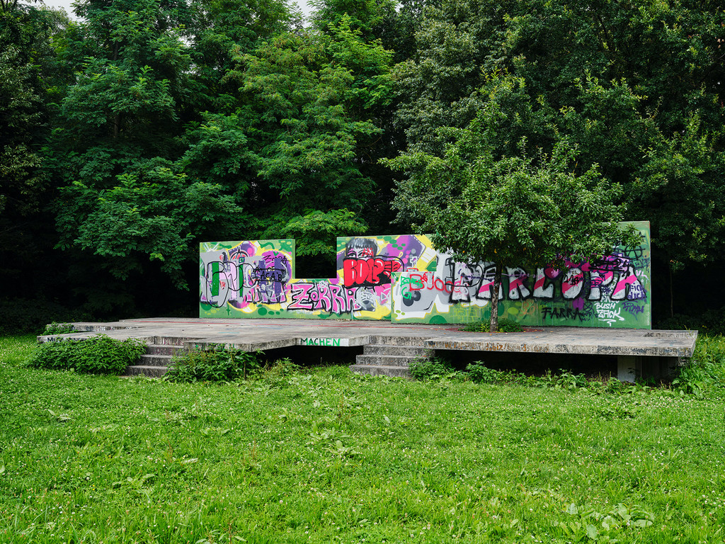 With the English title Bandstand, another conceptual element comes into play, which points toward Coley’s native country—Great Britain. Seen today, these bandstands have deeper roots in the culture of Great Britain than that of Germany. This form of concert pavilion came into fashion in the Victorian era and can be found in many public parks as a remnant of the period. As a rule they take the form of a narrow and high tent, have a roof, and often have a decorative wrought-iron railing running along the edge of the elevated platform. The only thing that a concert pavilion and the sculptures in Brasília and Rieselfeld share is that all are communal platforms, which anyone can access. On the weekends and holidays, concerts used to take place on these bandstands. They were also often the place of political gatherings, meetings, and demonstrations, recalling the Speakers’ Corner in Hyde Park in London. Although they are used less today, they are perceived as relics of another time instead of sculptures. Coley’s Bandstand does not make reference to this structure through its composition but only through its title. Due to the artist’s conceptual approach, Bandstand has a global scope as it incorporates references from South America and Great Britain as well as allusions to other countries and cultures. In the process, no specific country is represented; the artist brings this distant place into a site-specific work for Rieselfeld.